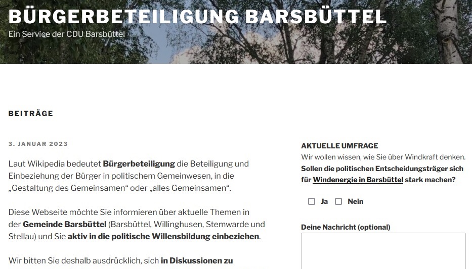 Die erste Umfrage ist bereits online und befasst sich mit der Frage, ob die Gemeinde Barsbüttel Windkraftvorhaben unterstützen sollte.
