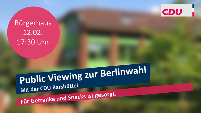 07.02.2023 Die CDU Barsbüttel lädt am 12.02.2023 ab 17:30 Uhr zum Public Viewing ins Bürgerhaus, Raum Stormarn. Getränke und Snacks stehen zur Verfügung. Anmeldungen sind nicht erforderlich. Empfehlen Sie uns!Bei Facebook teilen Bei Twitter (X) teilen Bei Whatsapp teilen Diese Seite drucken Diese Seite einem Freund schicken