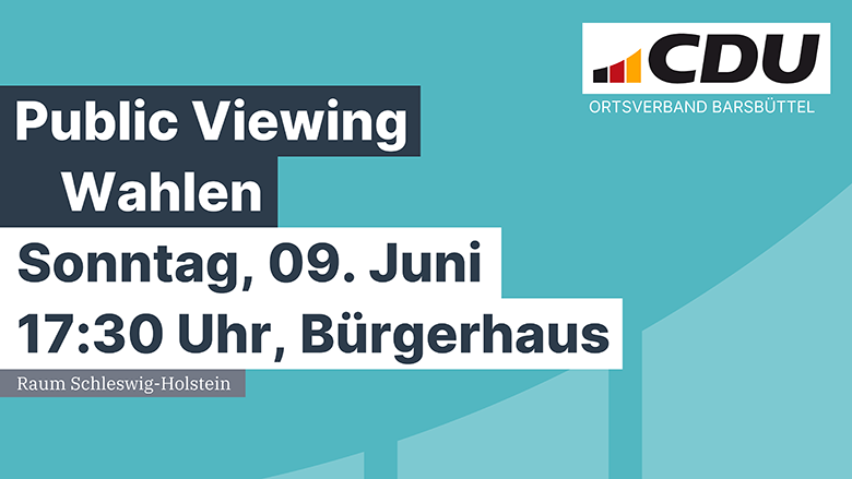 Die CDU Barsbüttel lädt ab 17.30 Uhr zum Public Viewing ins Bürgerhaus (Raum Schleswig-Holstein). Hierzu erklärt Henri Schmidt (Fraktionsvorsitzender in der Gemeindevertretung): „Wir wollen in gemütlicher Atmosphäre die Ergebnisse der Wahlen anschauen und diskutieren“. Eine Anmeldung ist nicht erforderlich.