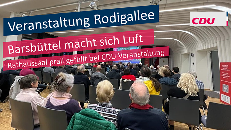 Kurzfristig änderte die CDU den Veranstaltungsort und wechselte vom Bürgerhaus ins Rathaus. Das war eine gute Entscheidung: der Rathaussaal war prall gefüllt. Das hatte sich bereits angedeutet, denn von den ca. 6.500 Unterschriften der Petition "Rettet die Rodigallee" kommen fast 900 aus Barsbüttel (diese Auskunft erteilte Frank Hiemer im Verlauf der Veranstaltung). Schließlich ist die Rodigallee die wichtigste Verkehrsader für die Gemeinde.